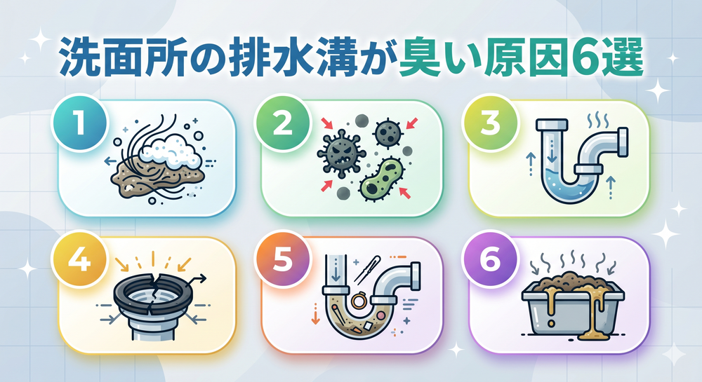 洗面所の排水溝から悪臭が発生してしまっている場合、主に以下6つの原因が考えられます。